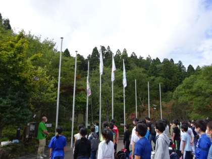 入所式の様子です。学年旗をかかげて、いよいよ活動が始まります。