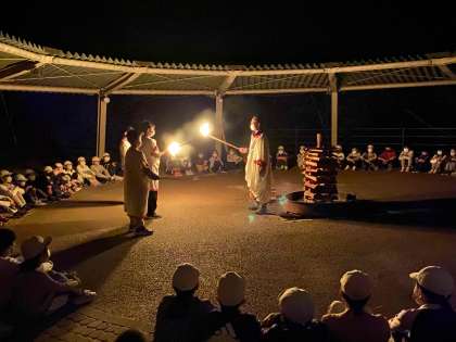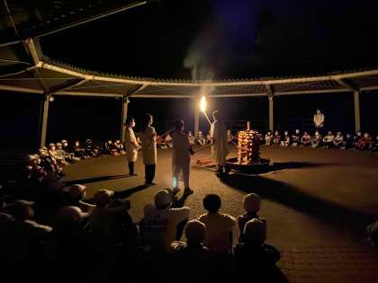 花背山の家の神様と火の子たちが入場、点火し、キャンプファイヤーが始まりました。