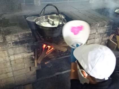 食材を切ったりする担当と、かまどで火をおこす担当に分かれて、それぞれ協力して調理を進めていきました。