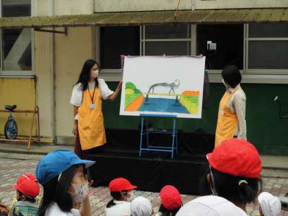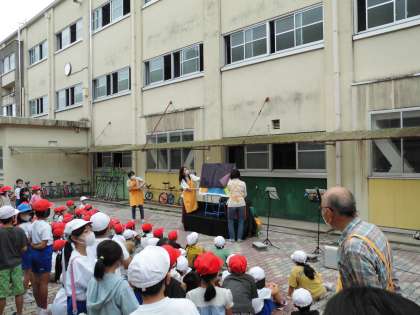 さわやかな秋晴れの中、中間休みに中庭で「のほほんあおぞらおはなしかい」が行われました。今日は「へんてこ へんてこ」というお話をパネルシアターで披露していただきました。次々に出てくる様々な仕掛けに、子どもたちは楽しみながらお話を聞いていました。次回は11月2日(水)を予定しています。