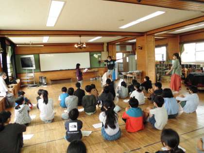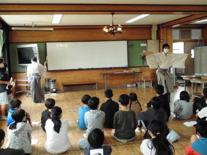地域の狂言師の方に来ていただき、狂言の学習をしました。前回指導していただいたことをもとに子ども達で「柿山伏」の一場面を練習してきました。今回はその練習してきたことを披露し、その場で指導をしていただきました。実際に演じてみることで、表現することの楽しさや難しさを肌で感じることができました。