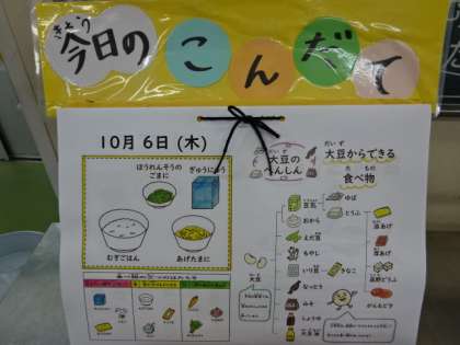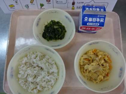 今日の献立は、「麦ごはん・牛乳・あげたま煮・ほうれん草のごま煮」でした。あげたま煮は、おあげのコクと卵のふわふわ感がよく、ごはんがよくすすみました。今日も美味しくいただきました。