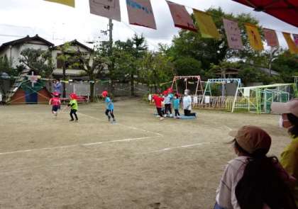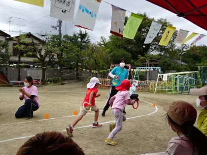 秋らしい良い天気の下、上賀茂幼稚園の運動会が園庭で行われました。たくさんの人たちに見守られて、園児たちはにこにこ笑顔で運動会に取り組んでいました。