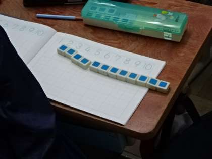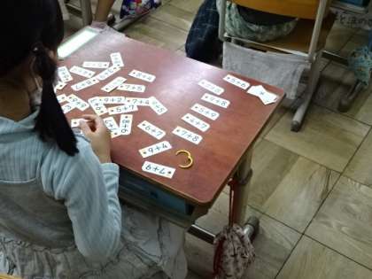 1年生は算数の時間、数図ブロックを使って、具体的な操作活動を通して学習を理解していきます。また計算カードを使って、繰り返し計算に取り組み、早く正確に計算できることを目指しています。