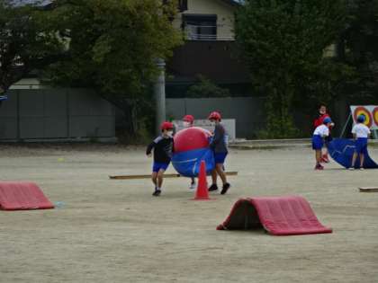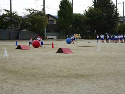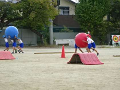 4年生は色別対抗の競技で、大玉おくりをします。いろいろな場が用意されていて、力を合わせて大玉を送っています。転がしたり、運んだり、本番は応援の声で盛り上がることだと思います。