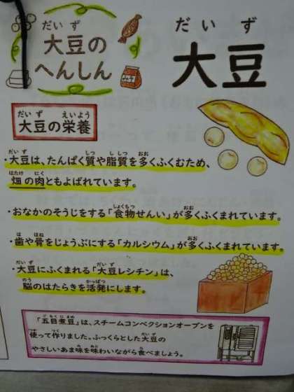 今日の献立は、「麦ごはん・牛乳・豚肉とキャベツのみそいため・五目煮豆」でした。3年生は国語の学習で「すがたをかえる大豆」の学習をしていて、タイムリーな献立でした。今日も美味しくいただきました。
