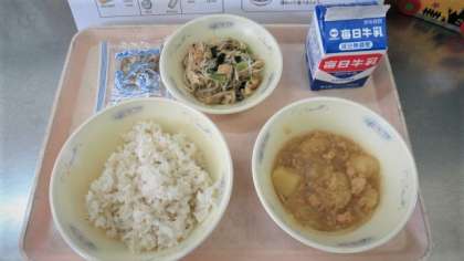 むぎごはん 牛乳 じゃがいものそぼろ煮 もやしの煮びたし じゃこ です。
