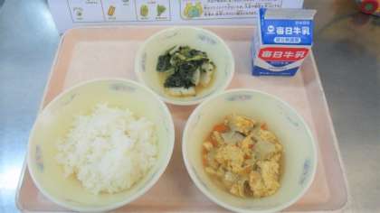 ごはん 牛乳 高野どうふの卵とじ ほうれん草と白菜のごま煮 です。