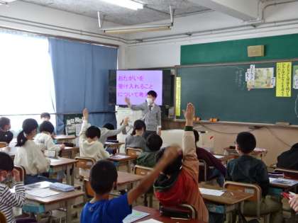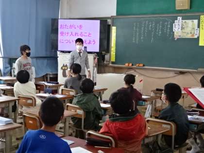 「折れたタワー」という読み物資料を読んで、お互いを受け入れることについて考えました。今日は他校の先生にも参観していただく中での道徳の時間でしたが、自分なりに考えたことをみんなで素直に伝え合いながら考えていました。