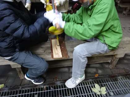 まずは、火おこし体験です。山の家の先生から教えてもらった通りにやっていきます。ひたすら摩擦をおこして、火種ができたら、それを大きな火にしていきます。