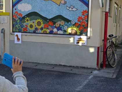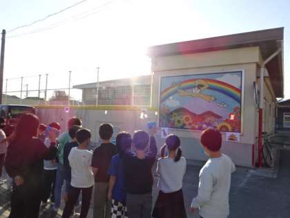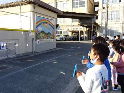 「太陽の光」の学習です。鏡で太陽の光をはね返して的に当てながら、光の進み方を調べました。