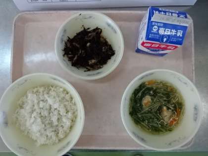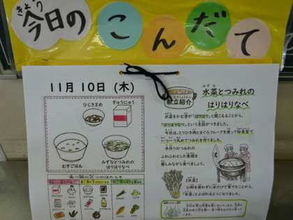 今日の献立は、「麦ごはん・牛乳・水菜とつみれのはりはり鍋・ひじき豆」でした。水菜とつみれのはりはり鍋は、水菜のシャキシャキ感と、つみれのもっちり感とが合っていて、子どもたちにも好評でした。今日も美味しくいただきました。