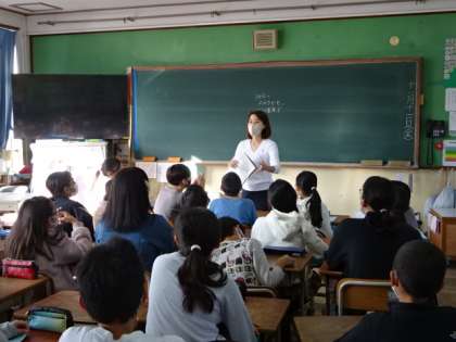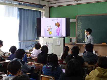 6年生の教室には、5年生の担任の先生が来てくれました。大型テレビに映し出して読み聞かせをする先生もいました。
