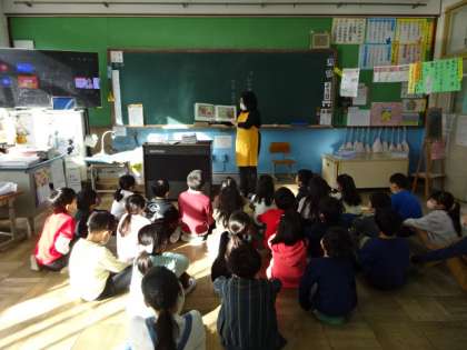 今日は、1組、1・2年の教室で読み聞かせをしていただきました。担任の先生も、子どもたちと一緒に読聞かせを聞いて、本の世界を楽しんでいます。