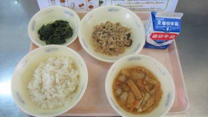 麦ごはん 牛乳 豚肉とこんにゃくのいため煮 ほうれん草のおかか煮