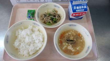 ごはん 牛乳 鶏肉と豆腐のくず煮 もやしのごま煮 黒糖 です。