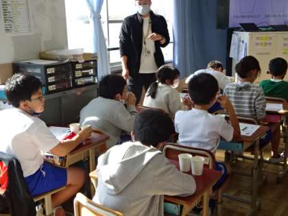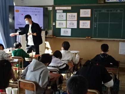 5年生と一緒に「だし」の学習をしました。「昆布とかつお節の合せだし」と「醤油と塩のだし」を飲み比べて、だしのうまみ実感してもらいました。