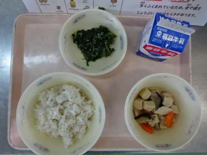 今日の献立は、「麦ごはん・牛乳・高野どうふと野菜のたき合わせ・ほうれん草とじゃこのいためもの」でした。高野どうふにあじがよくしみ、ごはんも進みます。今日も美味しくいただきました。