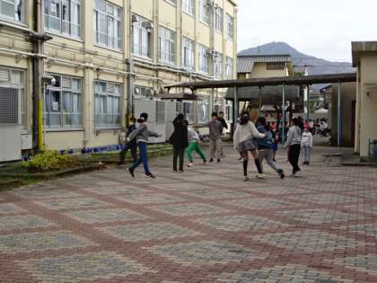 中間休み、6年生が中庭で大なわで遊んでいました。卒業を意識しだす時期です。友だちと過ごす時間を大切にしています。
