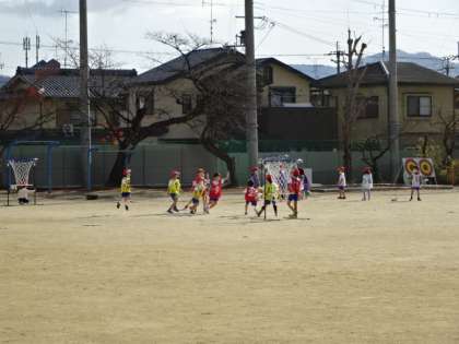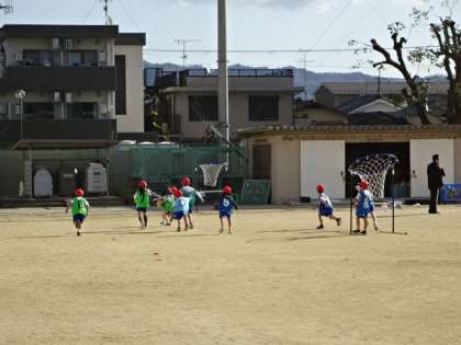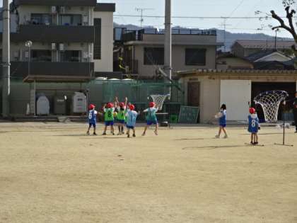 パスゲームの学習が始まっています。お互いに声を掛け合い、パスをつないでゴールを目指します。張り切ってゲームを楽しんでいます。