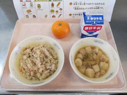 炊きこみ五目ごはん 牛乳 みそ汁 みかん です。