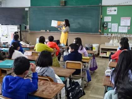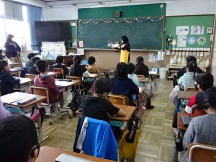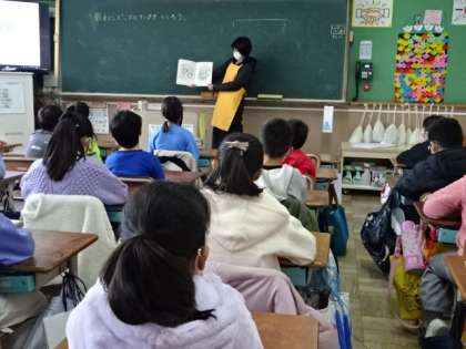 今日は3・4年生の教室で読み聞かせをしていただきました。担任の先生も一緒に本のお話の世界を楽しんでいます。
