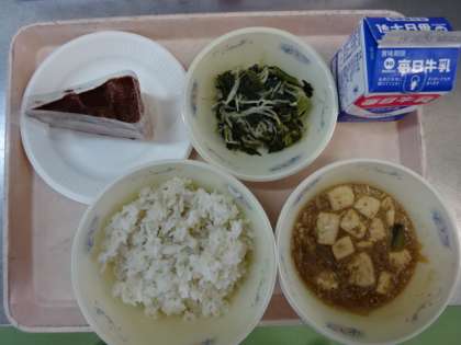 今日の献立は、「麦ごはん・牛乳・マーボどうふ・ほうれん草ともやしのいためナムル」でした。そして、今日はクリスマスプレゼントでチョコレートケーキがついて、みんな大喜び。今日も美味しくいただきました。