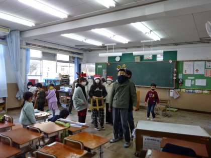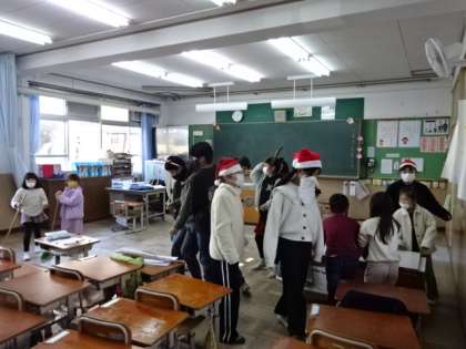 1年生の教室掃除の様子をのぞくと、サンタさんやトナカイさんが。教室掃除を手伝いに来てくれている6年生が、1年生に一緒に掃除を頑張ってもらおうと、衣装を身に付けてお手伝いに来てくれていました。優しい6年生たちです。ありがとう!