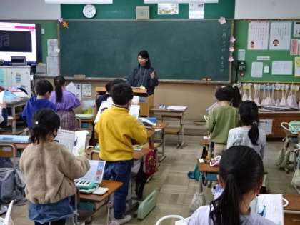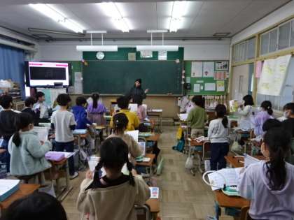 音楽の時間の様子です。先生の伴奏に合わせて歌います。元気な声だけでなく、美しい歌声を響かせることができるように、みんな一生懸命に歌っています。