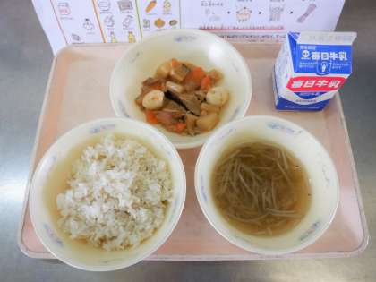 麦ごはん 牛乳 プリプリ中華いため ミーフンスープ です。