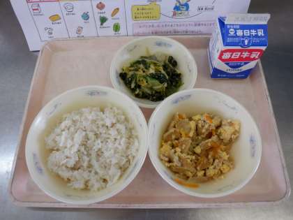麦ごはん 牛乳 あげたま煮 ほうれん草と白菜のごま煮 です。
