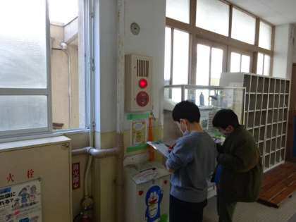 「火事をふせぐ」の学習で、校内の消防設備を自分たちの目で確認していきました。把握していることもあれば、今回新しい発見もあったようです。