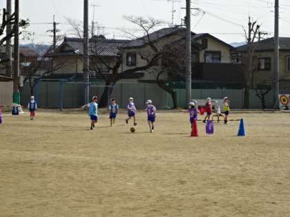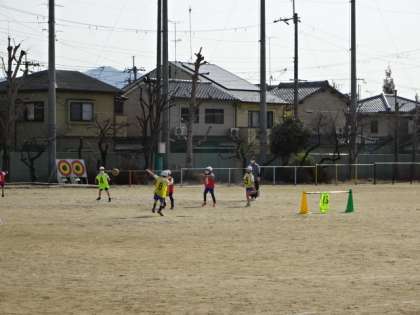 「ボールけりゲーム」の学習をしています。チームで声をかけ合いながら、元気にゲームに取り組んでいます。