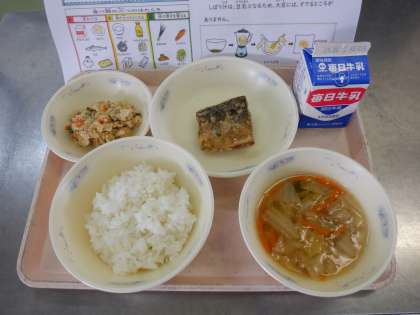 ごはん 牛乳 さばのたつたあげ おから 白菜の吉野汁 です。