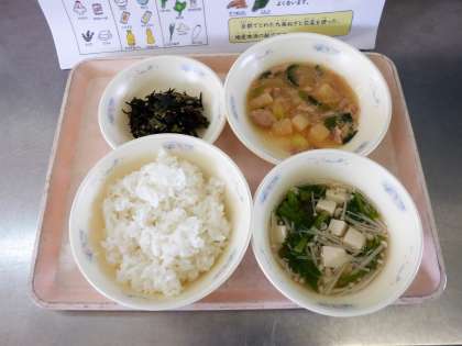 ごはん あまから鶏だいこん 小松菜とひじきのいためもの 花菜のすまし汁 です。