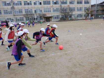 今回は4年生がサンガつながり隊の方々と交流です。楽しそうにボールを追う姿がありました。