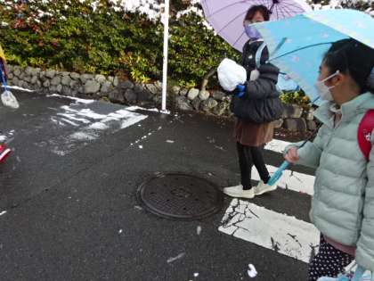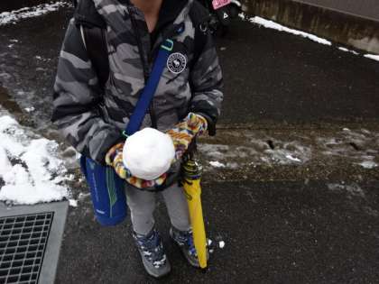 今日も朝から雪が舞う中での登校でした。冷え込みも厳しい中ですが、雪玉を手にしながら登校する子もいました。雪にも寒さに負けず、子どもたちは元気です。