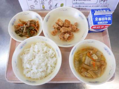 ごはん 牛乳 鶏肉のこはくあげ 野菜のきんぴら 白菜の吉野汁 です。