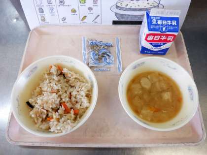 炊き込み五目ご飯 牛乳 みそ汁 じゃこ です。