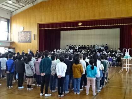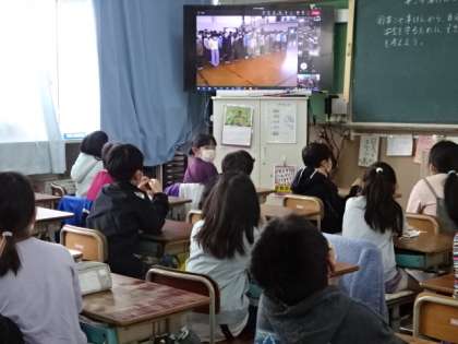 6年生を送る会です。お世話になった6年生に、お礼の気持ちを込めて、各学年から発表です。体育館に集まった6年生に向けて、学年が順番に体育館に入り、歌やダンス、言葉を届けました。発表していない学年は、各教室でその様子をオンラインで観賞しました。