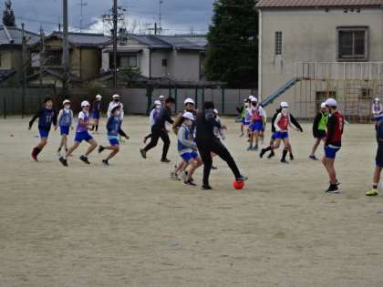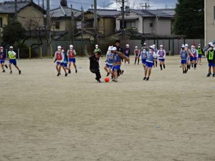 サンガつながり隊の方とのサッカー教室。最後は6年生が一緒に楽しいひと時を過ごしました。さすが6年生、サッカー選手にもひるまずにボールに向かっていく姿もありました。