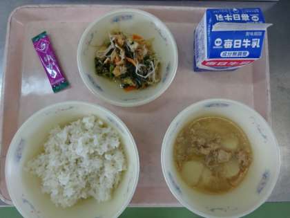 今日の献立は、「麦ごはん・牛乳・じゃがいものそぼろ煮・もやしの煮びたし・ふりかけ(しそ)」でした。じゃがいものそぼろ煮は、じゃがいものホクホク感、そして、しょうがのピリッとした味付けで、美味しくいただきました。今日は、ふりかけもあり、ごはんがよく進みました。今日も美味しい給食、ごちそうさまでした!