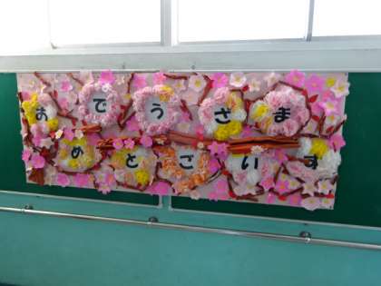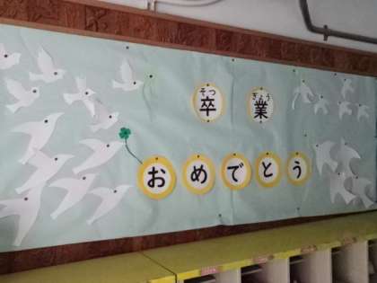 それぞれ廊下や階段の掲示板がお祝いメッセージで飾られています。卒業式は間近です。