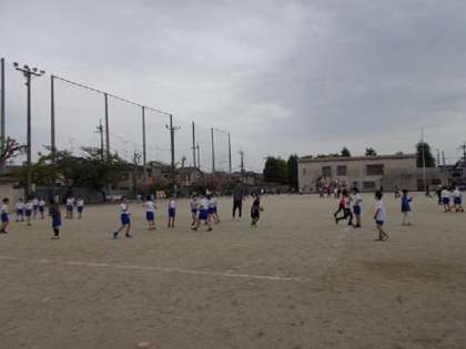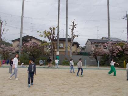 昼休みの時間は、運動場に出て遊んでいる子どもたちがたくさんいました。先生たちも一緒になり、体を思いっきり動かして、とても楽しそうです。運動場には躍動感がいっぱいに広がっています。