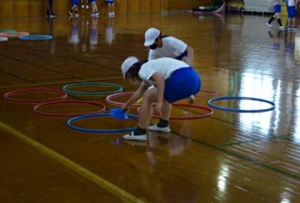 体ほぐしの運動に取り組んでいます。運動を通して、新しく一緒になった仲間との親睦もはかっています。