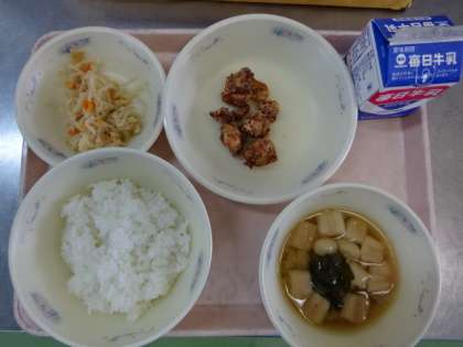 今日の献立は、「ごはん・牛乳・鶏肉の塩こうじあげ・切干大根の煮つけ・みそ汁」でした。今日も大人気メニューでした。少しひんやりとした今日みたいな日は、温かいみそ汁でほっこりできます。今日も美味しい給食、ごちそうさまでした!