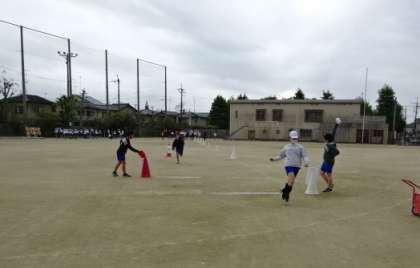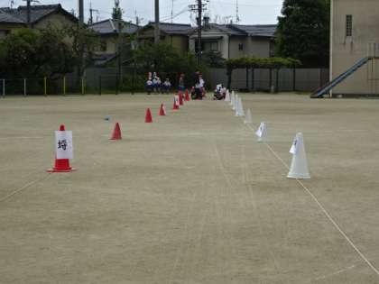 お話を受けて、実際に自分たちで賀茂競馬のやり方を体験してみました。カラーコーンで作った埒の中を左方・右方に分かれて走りました。自分たちで走ってみると、競馬の様子が少しずつ分かってきたようで、左方・右方のどちらが勝ったかで盛り上がっていました。
