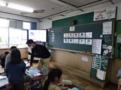 外国語の学習の様子です。友だちとの英語でのコミュニケーションも大切にしながら、学習を通して英語に慣れ親しんでいきます。
