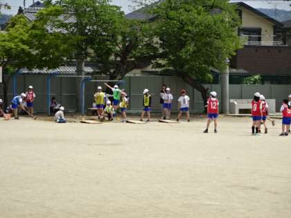 走りはば跳びをしています。自分の記録を伸ばそうと、助走や踏み切りのタイミングを試しながら力いっぱい挑戦しています。