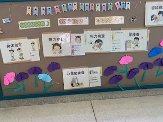 健康診断についてどんなふうに検査を行うのかな。保健室前の掲示板をぜひ見てください。右側のインデックスを引っ張ると、どんな検査をするのかが分かります。